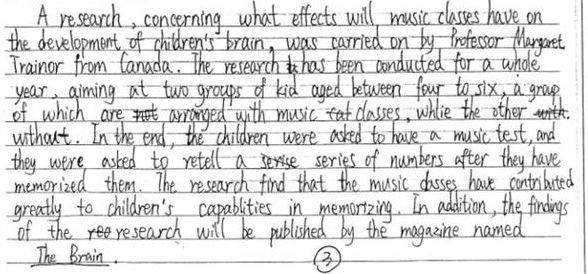 本文能够覆盖所有的信息点,能够尝试使用不同简单的句式结构,语言表达错误较多,但基本能够表达信息内容。